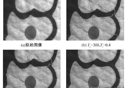 將JSEG 算法應(yīng)用在紡織品圖像的分割當(dāng)中,其分割效果主要由2 個(gè)主要的參數(shù)控制,即顏色量化閾值( Tc ) 和區(qū)域合并閾值( Tr )。實(shí)驗(yàn)選取由 FEITH 智能相機(jī)在日光條件下所拍攝的大小為 680 × 480,分辨率為260 dpi 的印染紡織品的圖片。圖2示出了不同參數(shù)設(shè)置下的分割效果,以圖2 ( a) 為基準(zhǔn)分別作比較。