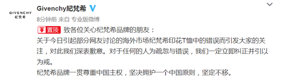 印花T恤中的錯誤而引發(fā)大家的關(guān)注,對此我們深表歉意。對于任何的人為疏忽與錯誤,我們一定立即糾正并引以為戒。紀(jì)梵希品牌一貫尊重中國主權(quán),堅決擁護一個中國原則,堅定不移。