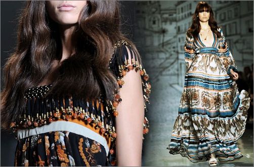 08秋冬時裝周的米蘭,Giorgio Armani秀場上的模特們穿著流蘇印花長裙,裹著波西米亞風(fēng)格的蕾絲刺繡披肩款款走來。數(shù)月后的羅馬,gucci 2009春季度假系列被鼓脹的大袖子和飄逸的印花雪紡長裙主宰著,模特們仿佛是不斷旋轉(zhuǎn)起舞的吉普賽女郎。