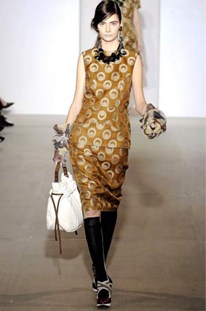 在簡(jiǎn)約風(fēng)格下,采用如藏青、土黃、墨綠、艷紅、淡粉等明亮色調(diào),讓09年夏天而那些充滿著復(fù)古主義風(fēng)格的“老式”外套,拼接的錐形高跟鞋,都是設(shè)計(jì)師低調(diào)而不招搖的表達(dá)。
