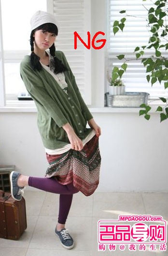 OUT:印花與開襟衫都是初春的大熱單品,單穿開衫與T恤的混搭可以把女孩子的俏皮可愛充分顯露,但是配上同色系稍顯沉悶的長(zhǎng)裙,最雷人的是那紫色的褲襪和帆布鞋,亂穿混搭是日系MM最喜歡的方式,可是你已經(jīng)不是小女生了,那就只能用土里土氣來(lái)形容了!