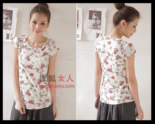 時尚解析:本季日本雜志中常見的花卉圖樣圓領短袖T恤,運用眼下熱門的印花元素,展現(xiàn)出年輕女孩的甜美風貌;左胸口處的雙車線口袋設計更是為整體造型加分不少,百搭款的版型設計,下半身可隨意搭配,無論與牛仔褲還是短裙搭配,清甜可人的穿搭風格,相當有日系甜美女生的風味喔!