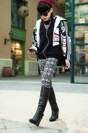 【集萃網(wǎng)觀察】個性圖案連帽休閑外套,選擇灰色衛(wèi)衣下穿個性花紋緊身褲和黑色坡跟中筒靴子來搭配,運動風(fēng)格,隨性大方。吳莫愁一貫的另類味道,墨鏡為這身搭配增色不少呢。