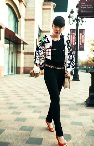 街拍中的吳莫愁鐘愛黑色,不過也加入一些跳色來應(yīng)景春天的氣息,像這款個性花紋連帽休閑外套,搭配鵝黃底色短褲,演繹小魔女獨有的酷感和俏皮的時尚味道。