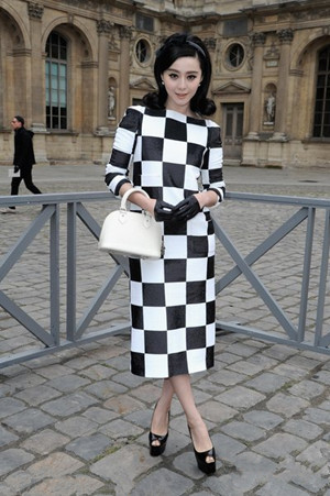 【集萃網(wǎng)觀察】范冰冰作為 Louis Vuitton 代言人身份現(xiàn)身 LV 2013秋冬大秀 。她穿著LV 2013春夏黑白棋盤格連身裙手拎白色Alma手袋亮相,獲LV設(shè)計(jì)師馬克-雅可布(Marc Jacobs)青睞。女星吳佩慈也登臺,不過無論是氣質(zhì)還是造型,都輸范冰冰。