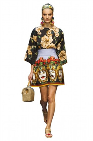 Dolce&Gabbana:印有大幅玫瑰圖案的寬大廓形上衣,搭配收腰、劇場人面像印花短裙,散發(fā)濃郁意大利風情。