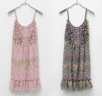 雪紡質(zhì)地的碎花吊帶裙,胸前有層疊的荷葉邊,細節(jié)感十足