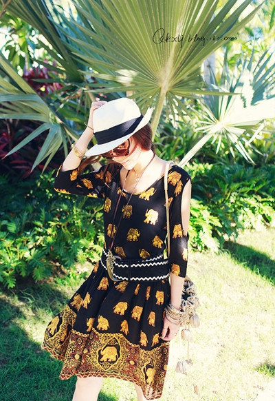 【集萃網(wǎng)觀察】 優(yōu)雅十足的連衣裙呢,清涼的雪紡面料,舒適透氣,性感十足的深v設(shè)計(jì),內(nèi)搭上裹胸就不會(huì)走光了,民族風(fēng)味道十足的扎染印花,浪漫唯美,優(yōu)雅大方,收腰的款式更顯腰身,再加上項(xiàng)鏈配飾,真是很有名媛氣質(zhì)呢!