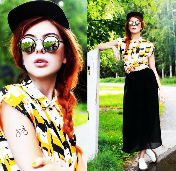 復(fù)古剪裁的印花襯衣為我們掀開了一份獨(dú)特的時(shí)尚印記感,腰間的系結(jié)設(shè)計(jì)更是勾勒出了纖細(xì)的腰線。高腰的黑色長(zhǎng)款紗裙帶著略微的透視感,為裝扮增添了一份輕盈感。綁在一側(cè)的麻花辮十分契合整體的田園風(fēng)情,整體效果十足。