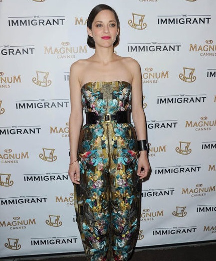 2013年5月27日,第66屆戛納國際電影節(jié),瑪麗昂-歌迪亞(Marion Cotillard)出席Magnum House派對,印花抹胸?zé)艋\褲一件式搞定,再搭配上一雙深色高跟鞋完美收官。同樣一條黑色腰封放在腰間調(diào)整比例。