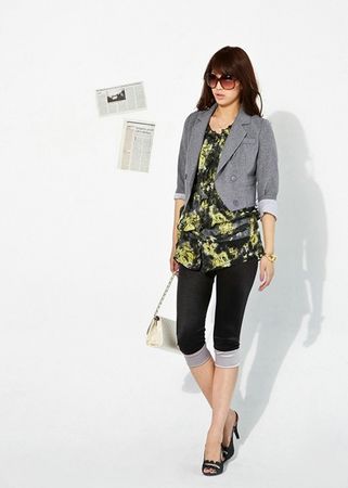 時(shí)尚點(diǎn)評(píng):印花一定是小女人的最愛嗎?錯(cuò)!印花同樣可以時(shí)尚個(gè)性,蠟染的效果、不規(guī)則的圖形給人帶來(lái)不同的感覺,黃色與黑色和灰色的協(xié)調(diào)搭配給人眼前一亮的感覺。