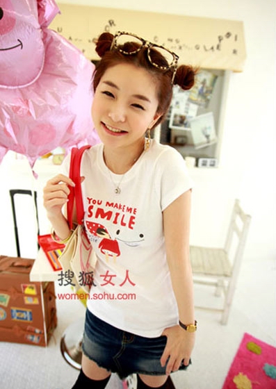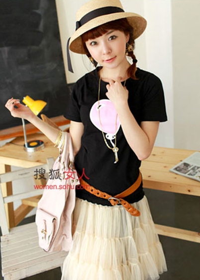 搭配建議:今年超流行的可愛印花T恤成為魅力時(shí)尚的品味穿著,合身的曲線剪裁,彩色的半身裙短裙除了在修飾身形效果十分不錯(cuò)之外,還展現(xiàn)出個(gè)性甜美的風(fēng)格。