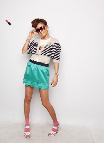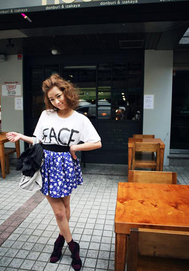 純色V領(lǐng)Tee與印花高腰圓擺短裙的搭配,凸顯身材,玲瓏有致,適合體型嬌小的女生。