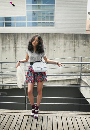 高腰圓擺印花短裙,與灰色基本款Tee搭配,低調(diào)時(shí)尚,造型的重點(diǎn)是——Tee的下擺一定要扎到裙腰里面。