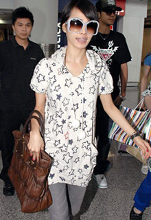 潮女蔡依林在裝扮上幾乎沒有讓人失望過,深得日本潮流天后濱崎步穿衣精髓的她裝扮都以日韓范兒為主,這一點(diǎn)與她不是很高挑的身材也有關(guān)系,可愛中又帶有個(gè)性化的裝扮最適合她了。星星印花的長衫和夸張的大墨鏡打造出搶眼的明星氣勢。