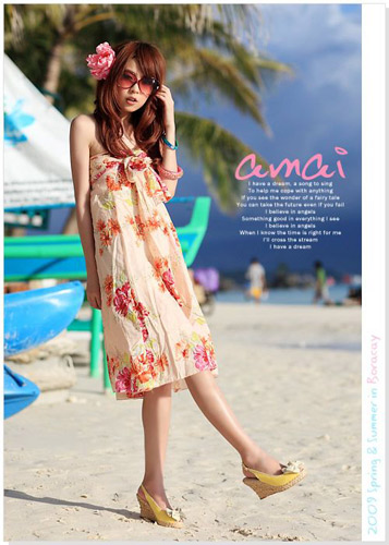 妖嬈夏威夷風情大印花紋,長到膝蓋的長度剛剛好凸顯了矮個MM纖細的小腿,搭配坡跟的藤編魚嘴高跟鞋,凸顯身形,頭上的花飾成功轉(zhuǎn)移注意力!