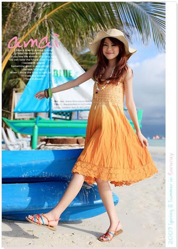 長款淑女風黃色蕾絲縷空大擺飄逸長裙,帶點浪漫的氣息,好似童話里走出的仙女。若MM覺得自己個子矮,小編建議你搭配一雙白色羅馬風格高跟鞋吧,可以讓你有增高的效果!