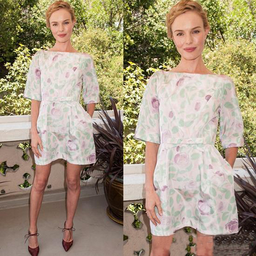 凱特·波茨沃斯 (Kate Bosworth)親身示范,如何將印花裙穿出優(yōu)雅與清新,綠葉與紫色的花瓣覆蓋在潔白的裙身上,一塵不染的潔凈,搭配一雙紅色綁帶尖頭高跟,極致的女人優(yōu)雅散發(fā)而來。