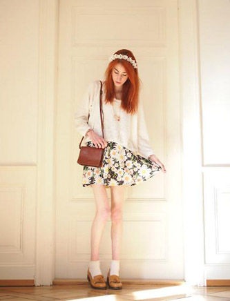 有了雛菊短款上衣,怎么能夠少了雛菊元素的高腰小短裙呢?搭配棕色小皮鞋和酒紅色單肩包的穿法,復(fù)古氣息十足。