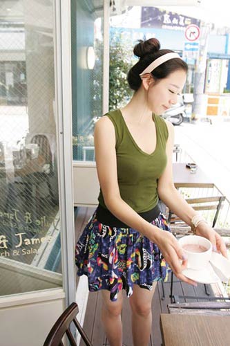 時尚穿衣搭配亮點:綠色背心搭配藍色印花裙,簡單涼快的裝扮,時尚度也一流。