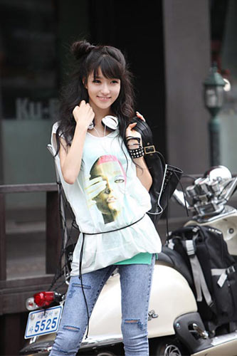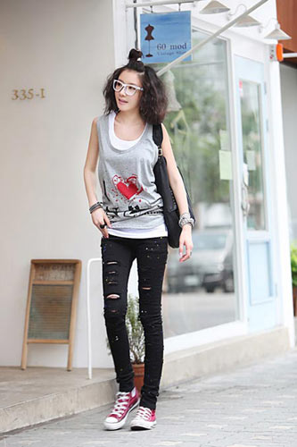 背心層疊穿著可愛俏皮,搭配黑色破洞牛仔褲,帥氣十足。