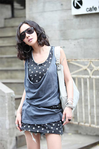 斜肩上衣是今夏的熱門單品哦,搭配星星圖案的長款背心,可愛調(diào)皮。