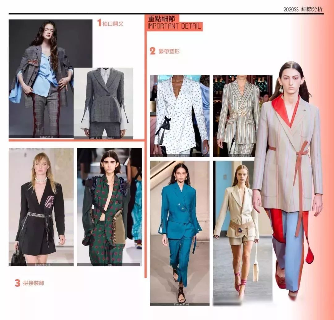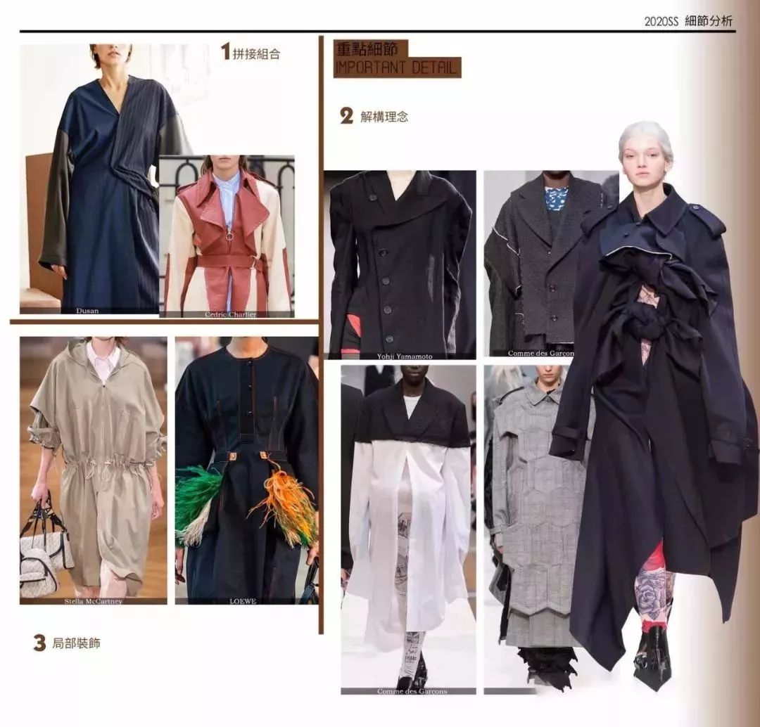 各種裝飾感細(xì)節(jié)更加具有高級感和定制精神,2020春夏時裝整體趨勢偏向休閑,結(jié)合結(jié)構(gòu)手法進(jìn)行細(xì)節(jié)上的重組,打破了趨于平面化的時裝設(shè)計。