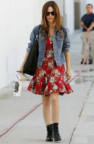 將充滿歐洲田園復(fù)古氣息花朵印花的紅色抹胸裙與美國西部牛仔硬朗范兒的高腰牛仔夾克Mix在一起,真是有創(chuàng)意。荷葉邊的裙邊散發(fā)女性浪漫柔情,牛仔上鉚釘?shù)难b飾帶出男性的不羈,加上足下軍靴風(fēng)格的中性黑色短靴,讓女性化的印花裙散發(fā)出獨(dú)特個(gè)性氣息。