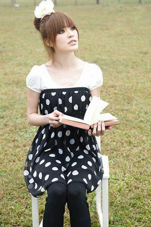 白色的花朵別在花苞頭上,黑白圓點的抹胸裙搭配純白色的T恤打造出可人的公主造型,很可愛!