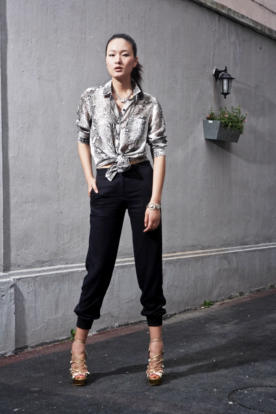 康倩雯(左):淡幾何紋連身裙、手鏈、坡跟鞋均為Fendi/手袋Dior 陳晨(右):幾何紋襯衫、白色及膝裙均為ShanghaiTang /高跟鞋Dior 衣身圖案—— 簡潔衣花紋渲染 如果說結(jié)構(gòu)是顯身材的,那么印花絕對是顯現(xiàn)氣質(zhì)的。田園風(fēng)格的小碎花,淡雅懷舊。野性彰顯的動物紋,冷艷性感。幾何風(fēng)格則體現(xiàn)了現(xiàn)代和未來感。每種圖案都有它自己的語言,即使是十分簡潔的款式,有了圖案的渲染就絕不單調(diào)。找到合適的圖案,演繹自己的風(fēng)情才是服飾最大的作用。 灰白蛇紋:本季新點 本季與高明度純色服裝并行不悖的是動物紋,豹紋常常與紅色或者桃紅色搭配出現(xiàn)在高跟鞋、小手包等配件中,而服裝上的花紋,本季出現(xiàn)了不少灰白蛇紋。這股風(fēng)潮從高級時裝的舞臺上一直波及到流行品牌。而原來常見的豹紋則很少在服裝上大面積呈現(xiàn)——可能真的很容易帶給人以“富貴外國老太太”的感覺吧。這種蛇紋襯衫所展現(xiàn)的視覺沖擊力給人更年輕的感覺,通常配搭黑色下裝會比較壓得住。而且整體風(fēng)格也比較中性,銀飾是最合適的飾品搭配。在腰間扎個小結(jié),將此款衣服穿的隨性,才把野性的性感演繹到極致。同時這樣也提高了腰線,和褲子搭配起來,加上綁帶高跟鞋的輔助,顯得雙腿更修長。 幾何花朵:時裝感更強(qiáng)烈 小碎花的連身裙每季都有,但其甜美氣質(zhì)經(jīng)過多年歷練,有時候不免有些“審美疲勞”。來看這條高腰線設(shè)計的連衣裙,色彩繽紛的幾何形和花朵圖案相結(jié)合,把前衛(wèi)元素與優(yōu)雅氣質(zhì)完美地結(jié)合在一起;y已經(jīng)如此繁瑣,配飾當(dāng)然需要簡潔,同樣幾何拼接的小包包就足夠了。此款衣服無論是花紋的走勢或是衣服本身的款式都比較適合細(xì)個的人,但略有些小肚腩或者胯部稍大都不是什么大問題。 豹紋可年輕幾何可懷舊 原本豹紋給人富貴老氣的印象,而輕淡雅致的幾何紋則使人感覺更為年輕。但設(shè)計師的創(chuàng)意畢竟高出一籌,兩張T臺圖片都給我們帶來新的感覺。人人都愛豹紋,但豹紋可不是你能輕易駕馭的,它一直以來都可是強(qiáng)勢性感的象征。 ChristopherKane則別出心裁地把簡潔款的豹紋緊身針織衫與明亮純色的花苞輪廓高腰裙結(jié)合起來,色調(diào)玩得令人眼前一亮。加上他的裙子以多個圓片拼接而成,立體感十足,一看就是設(shè)計師作品,值得欣賞。 幾何花紋老玩家EmilioPucci的這一身裙子,則分明給人帶來20世紀(jì)80年代的感覺——“摩登80年代”可是2009秋冬的一個重要流行點,我們在春夏便可見到端倪。橙色、粉色、藍(lán)色、黃色、白色,凡是能讓你感到輕松愉悅的色彩都以拼接的形式,布滿整個服飾。充滿了濃郁的意大利風(fēng)情。當(dāng)然你還得要張精致的臉,不然大家就光欣賞這幅平面作品了。既然講的是衣身圖案,那么它一定是作為一個視覺中心點,一個最突出的地方。所有的搭配只是為了輔助花紋本身所展現(xiàn)的風(fēng)格,或者為了壓住它,不顯輕浮和俗氣。這些圖案已經(jīng)足夠花哨了,如果再搭配更多的色彩的話,就會讓整體造型十分混亂。如果臉不夠緊致,暗花也是個不錯的選擇。 衣身圖案—— 輕快漆皮大手袋 MulberryBayswater系列手袋遵循Mulberry的取名傳統(tǒng),Bayswater得名自倫敦西部的一處地名,盡管推向市場不過數(shù)年光景,卻憑借簡潔經(jīng)典超級好搭的設(shè)計以及扎實的做工贏得了大批“粉絲”,其中包括兩代超模一姐KateMoss及AgynessDeyn。不可否認(rèn)的是,與HermesBirkin有些神似的身形也是其贏得關(guān)注的重要因素之一。 夏季搭配圖紋衣衫,選擇如Pucci那樣色調(diào)飽滿的圖紋配件效果出眾,操作起來也很省心,但僅靠不同圖案的變化來營造多層次,在形式感上略顯單調(diào)。其實,在材質(zhì)與色彩的對比上做文章,比如拿一只亮色漆皮手袋與圖紋搭配在一起,看起來要大氣得多。 與其它大牌手袋一樣,MulberryBayswater的經(jīng)典長青款也是基本的黑色、褐色與皮革原色,它們是萬年無折的,但每季新出的配色在換季時都多少會有些折扣,像這款發(fā)色飽滿的朱紅紋皮Bayswater,絕對也是百搭經(jīng)典款,若遇上打折非常值得投資。別小看了本季Bayswater的漆皮材質(zhì),它可是最新技術(shù)研發(fā)的工藝結(jié)晶。在提升品質(zhì)感的同時,它減輕了自重,并且更為柔韌耐用,大大提升了使用舒適度。雖然KateMoss提的是價值7000英鎊的稀有皮革定制版,但Bayswater普通版的價格卻很適中,據(jù)說在英國憑學(xué)生證購買Bayswater即使是萬年無折的黑色款也能享受折扣,折后價約為300英鎊,很適合作為入門款奢侈品購入。溫馨提示,Bayswater包身內(nèi)沒有布面襯里,經(jīng)過使用包內(nèi)側(cè)的皮屑比較容易被包內(nèi)硬物刮下,影響手袋使用壽命的同時,也會令包內(nèi)顯得很邋遢。因此我們推薦找個大小適中的防塵套套在內(nèi)部,如同袋中袋一般,定期取出清洗起來也很方便。 為什么我們要推薦這款手袋? 當(dāng)然,幾乎整個夏季我們都在說亮色手袋,那與花里胡哨的圖紋相搭配的亮色手袋,又與之前介紹的有何不同之處呢?首先,要與衣身圖紋的色調(diào)協(xié)調(diào)。不想出錯的話,可以選擇與服裝圖紋的其中一種亮色同色調(diào)的純色手袋,對自己混搭技術(shù)有自信的女生