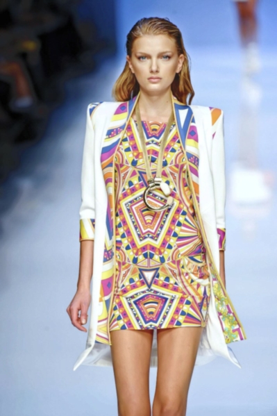 【集萃網(wǎng)觀察】服裝無非是結(jié)構(gòu),面料和花紋。我們最愛穿的T恤,就是以衣身圖案作為主打變化;衣身上的花樣也被專門列為紡織品設(shè)計中的一種,被大量的設(shè)計師著重利用。今夏依舊印花活躍,在2009年春夏的T臺上諸多類型的印花元素占據(jù)了大半江山。本版這兩件都是幾何花紋,右邊立領(lǐng)的款式和白色及膝裙,抽象圖案十分搶眼,藝術(shù)感和未來感十足。像是一幅平面藝術(shù)作品,這樣的花式足以擺脫你對襯衫古板的偏見了吧!而同樣是幾何花紋,左邊的連身裙顯得含蓄很多。乍一看十分普通的裙子,清淡雅致的幾何紋淡雅清新。簡單卻又豐富才是設(shè)計師最難的任務(wù)。