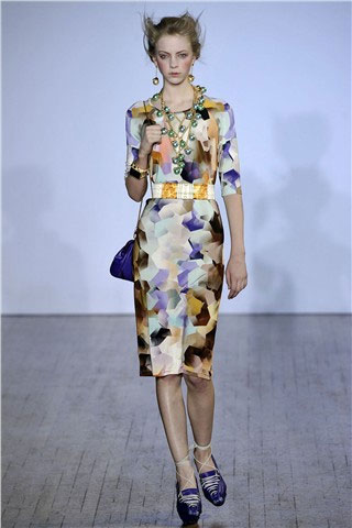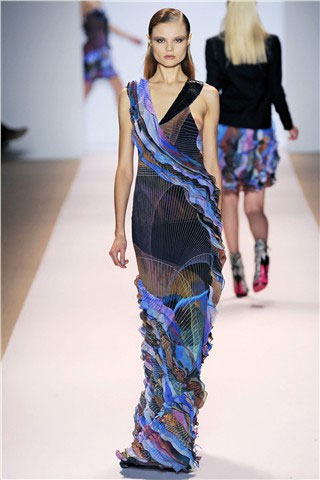 Matthew Williamson:電腦制作的數(shù)學(xué)圖案,結(jié)合色彩的漸變和層層荷葉邊,讓二維的平面體現(xiàn)出空間的縱深。
