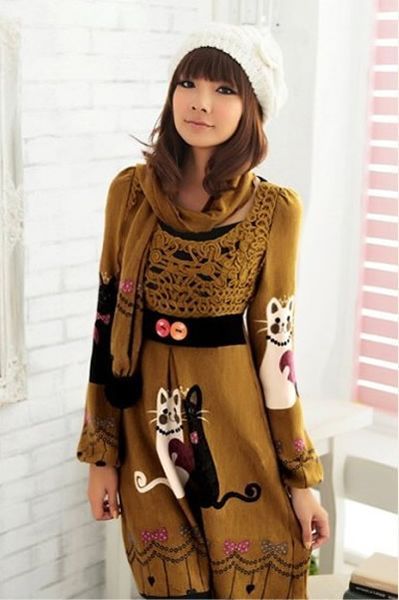 點評:黑白小貓圖案的黃色連衣裙很別致,收腰的款式可以提升整體比例,讓人看起來更高挑,戴上同色系圍巾讓你更吸引眼球,針織帽展現(xiàn)出小女人的可愛氣息,周末和男友的約會穿上這款連衣裙是最合適不過了!