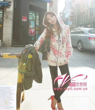 白底紅薔薇圖案的衛(wèi)衣搭配leggings,紅色鉚釘高跟鞋。外套可以搭配軍綠色工裝,成功塑造甜辣女的Fashion出街范兒!