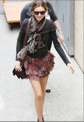 時(shí)尚解析:米蘭達(dá)蠟染效果的圍巾,風(fēng)格十分突出,時(shí)尚中又透露著幾分民族風(fēng),和小碎花短裙相得益彰,配上及踝靴,歐美風(fēng)十足。