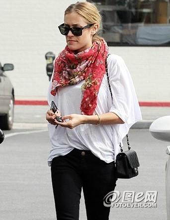 春日是繁花盛開的季節(jié),當(dāng)然少不了一條印花的圍巾。Kristin Cavallari選擇了一條中國(guó)風(fēng)紅花圍巾,除了保暖之外也為整款素雅裝扮增添畫龍點(diǎn)睛的效果,更添幾分田園氣息。