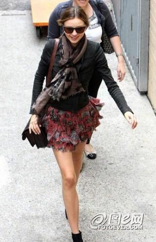Miranda Kerr蠟染效果的圍巾,風(fēng)格十分突出,時(shí)尚中又透露著幾分民族風(fēng),和小碎花短裙相得益彰,配上及踝靴,歐美風(fēng)十足。