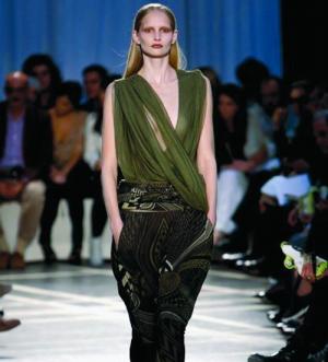 圖2:GIVENCHY 2010春夏女裝秀場,冰冷麻豆的臉搭配像冷血爬行動物般的印花褲裝,快令人窒息。