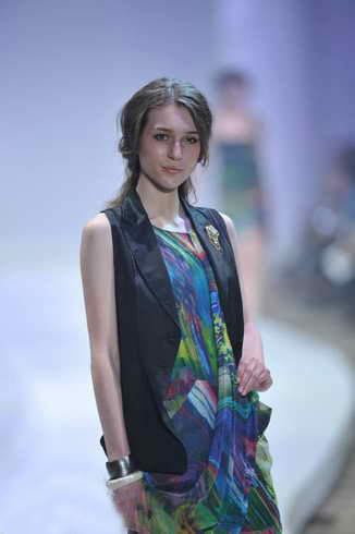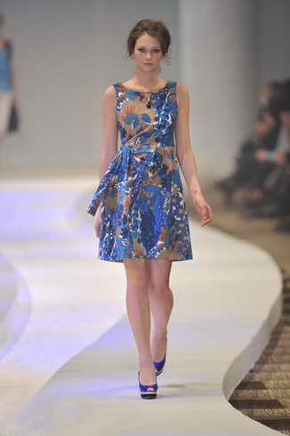 Marisfrolg今年春夏時裝的發(fā)布會也同樣大量的運(yùn)用了印花面料,這件彩色印花雪紡連衣裙搭配黑色的青果領(lǐng)馬夾,黑色壓住了彩色印花的輕浮,色調(diào)明快鮮艷。
