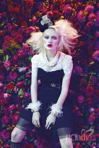 無力的支撐著身軀,黑白蕾絲的配搭本來是很單調(diào)的,但是當注入新的元素時就顯得異;钴S,例如羽毛。玫瑰的花墻五彩繽紛,很容易就會淹沒其中,猶如羽毛一般散亂的發(fā)型,同樣配以小花禮帽,羽毛的躍動增添了整體的動感,賦予人物一點生氣。