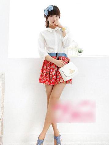 紅綠配色的花朵紋樣點綴在柔軟的高腰短褲上,搭配西瓜紅色底衫和純白色西服夾克,用艷麗的復古色彩描繪摩登大女人的輪廓。
