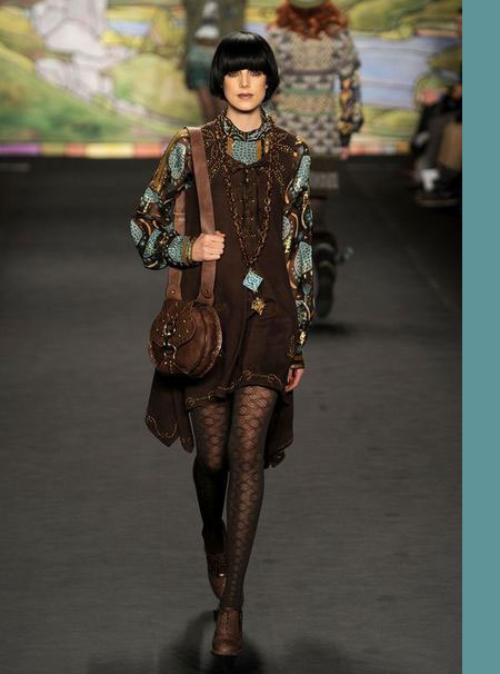 每季,AnnaSui總是帶來一些風(fēng)格強(qiáng)烈的印染、絲綢亞麻和極具裝飾效果的織物。這些裝飾元素給她的作品增添了無與倫比的豐富性。2010秋冬系列AnnaSui女裝也不會(huì)讓觀眾失望。在2010秋冬系列AnnaSui女裝的秀場上,從印有彩繪玻璃圖案的印花裙、金色紅石榴圖案設(shè)計(jì)的大提花夾克到炫麗的印花絲襪都讓追隨者們看得眼花繚亂。