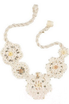 花朵也不一定都鮮艷奪目,素色的編織花形項(xiàng)鏈帶來不一樣的清新感覺。一款頗具田園風(fēng)情的配飾,五朵精心鉤織的花朵大小對(duì)稱一一排列,花瓣與花蕊以銀質(zhì)小珠裝飾,低調(diào)中不失華美。