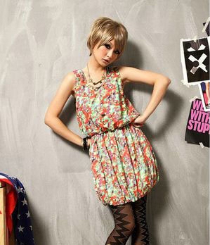 充滿藝術(shù)感的水粉印花連衣裙,無袖的處理充滿夏日的迷人魅力;而收腰的處理很好地修飾了腰身,裙身的燈籠裙處理,顯得你相當(dāng)摩登俏皮;菱格線條絲襪非常搶眼,“壞”女孩從來都是求搶眼的哦!