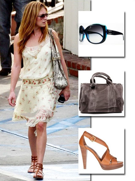 搭配建議:藍(lán)色碎花連衣裙,清新自然,簡(jiǎn)約的款式好似夏日里的一陣涼風(fēng)!動(dòng)物皮手包呼應(yīng)金屬絲高跟鞋搭配的恰到好處!
