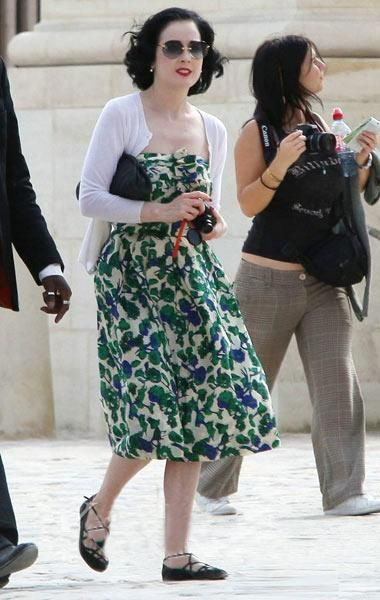 這位優(yōu)雅的美裙女王對(duì)于印花裙的搭配讓人賞心悅目,綠色的抹胸連衣裙帶來(lái)清新的田園風(fēng)格,胸前的荷葉邊裝飾散發(fā)溫柔的女人味兒。白色的針織開衫帶來(lái)一絲甜美味道,讓黑色的芭蕾平底鞋不會(huì)顯的過(guò)于沉悶。