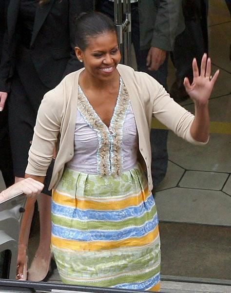 Michelle自成為第一夫人后穿衣風(fēng)格狂受追捧,主張平價(jià)衣搭出時(shí)髦味的她這次的選擇有失水準(zhǔn),可愛的荷葉邊開襟固然可愛,但是裙裝的橫條紋裙擺與之呼應(yīng)驚現(xiàn)水桶腰,整體時(shí)尚度大打折扣。
