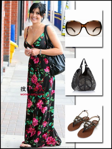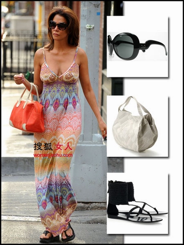 搭配建議:本身這條五彩印花長裙,不論是顏色還是圖案都給人清新的感覺,在這個30杜的高溫天中,是再好不過了!橘色拎包很搶眼!