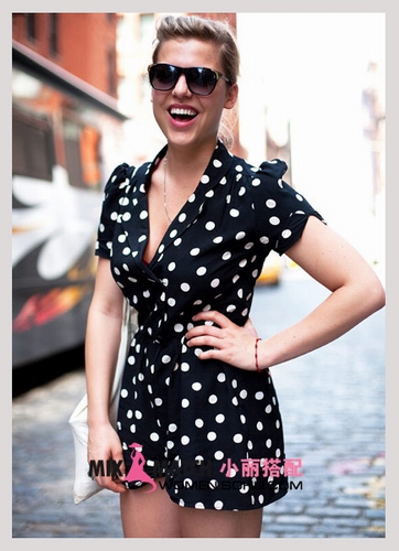 黑底白點的深V印花連衣短裙,顯出曼妙身姿,搭配簡單的人字拖,再加上復古的挎包,頭上可以搭配同樣是圓點圖案的發(fā)飾,十足的甜美性感裝扮。