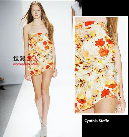 時(shí)尚解析一:美麗的女人,總需要美麗的鮮花陪襯。鮮花可能不常有,鮮花也總會(huì)有凋謝的一天,但裙子上那些嬌艷的花朵圖案,拼接的彩色條紋,卻是裝扮女人最好的最美的永不褪色的裝飾品。